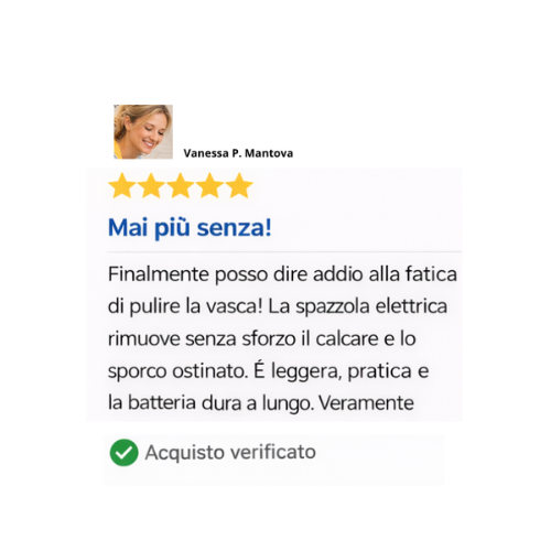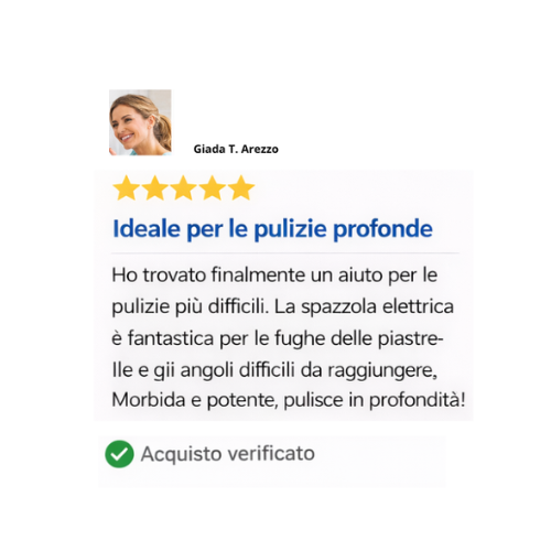 Con questa spazzola elettrica ricaricabile per pulizie domestiche, dire addio allo sporco diventa semplice. Meno fatica, più risultati e più tempo libero per te. Trasforma le pulizie in un’attività veloce e soddisfacente e mantieni la tua casa sempre pulita e brillante.